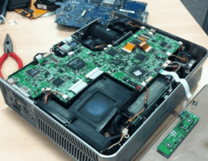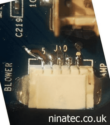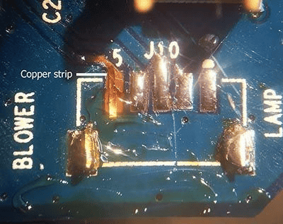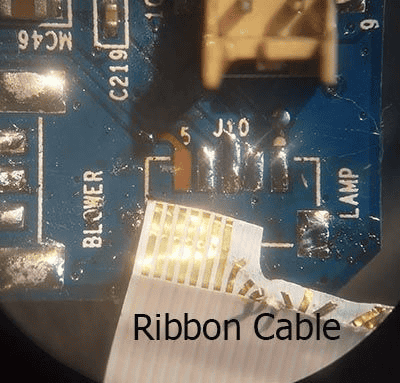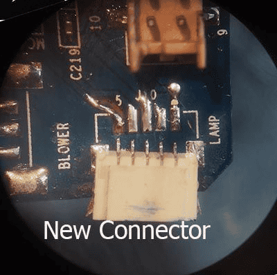 Here we are repairing a broken connector on a projector motherboard.